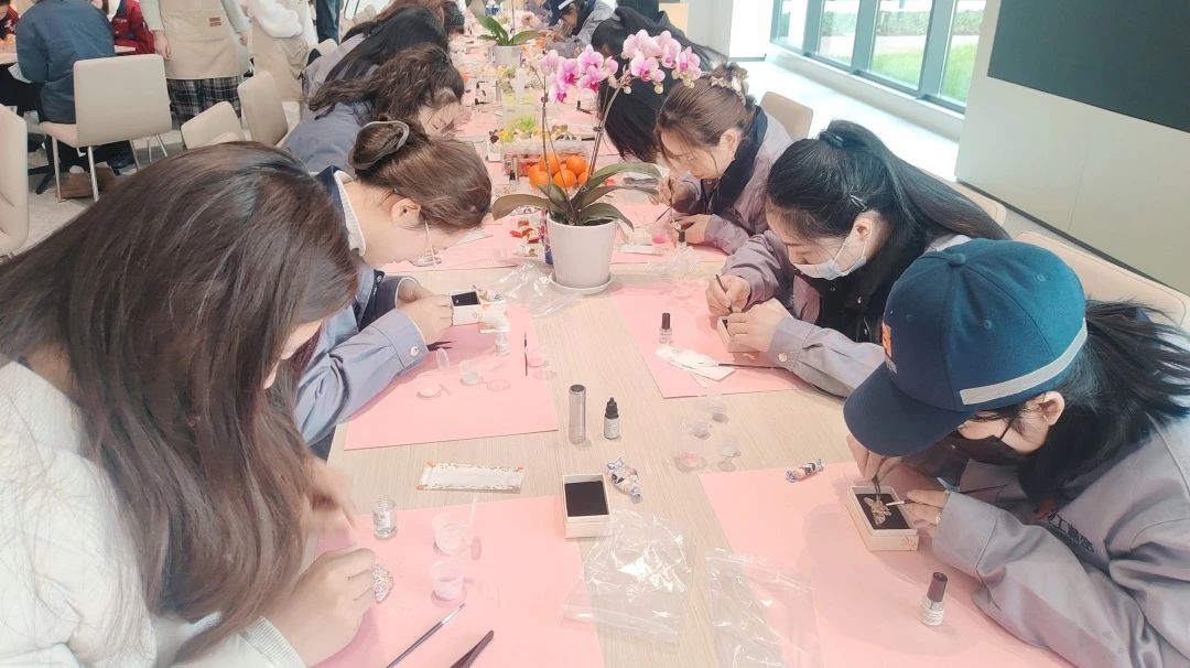 與此同時,常熟分公司的非遺螺鈿胸針制作活動,將傳統技藝融入現代職場。螺鈿工藝傳承人現場講解千年技藝的歷史與精髓,女員工們化身“巧手匠人”,在貝母的流光中雕琢匠心:挑選螺片、設計紋樣、鑲嵌打磨……方寸之間,花鳥紋樣盡顯江南雅韻,幾何構圖呼應現代審美。活動不僅讓員工體驗了非遺文化的魅力,更讓她們感受到公司對女性精神生活的重視。